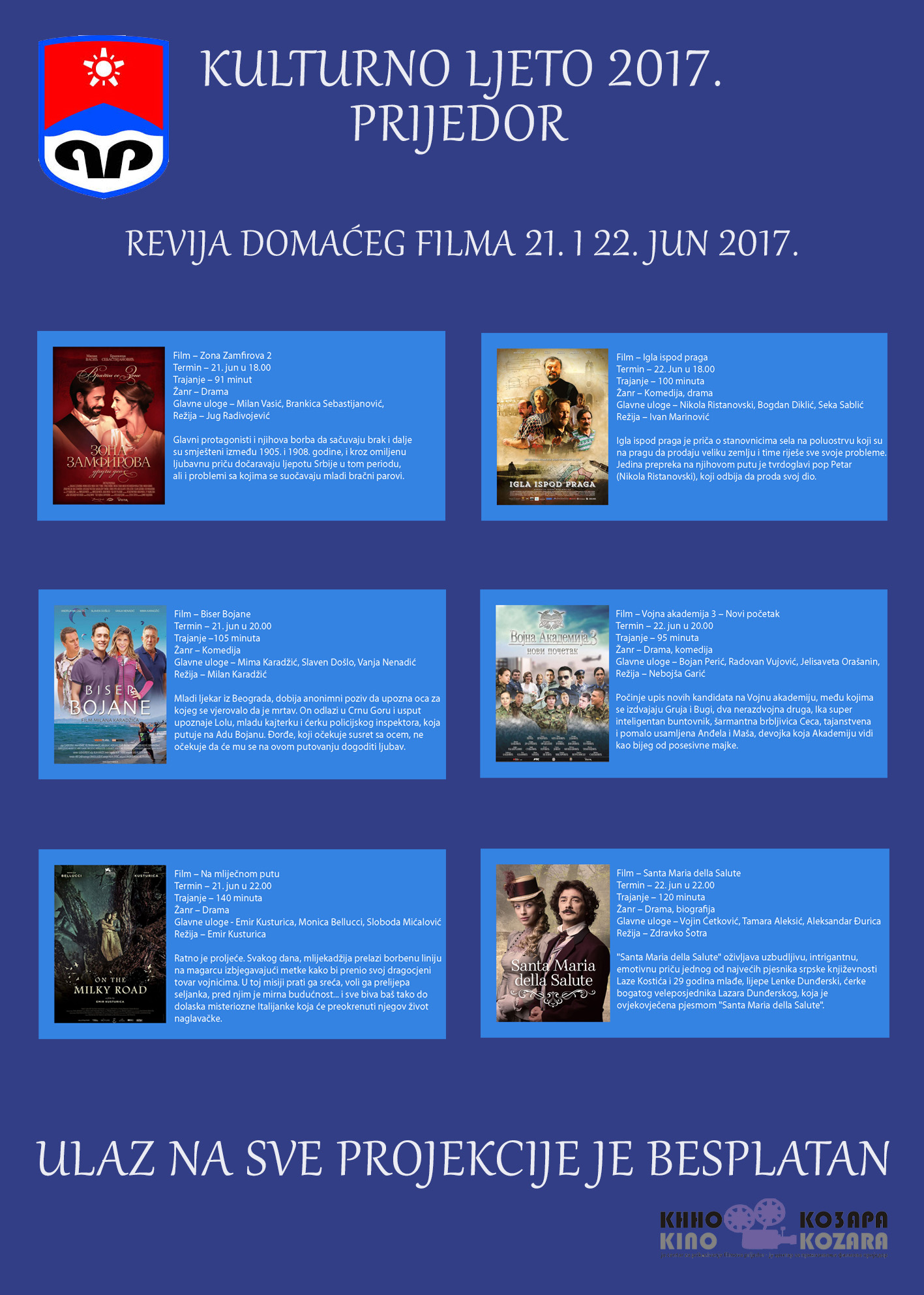 Kao i svake godine do sada kino Kozara će svoje učešće u Kulturnom ljetu obilježiti sa nekoliko filmskih revija. Prva u nizu jeste revija domaćeg filma na kojoj će naši posjetioci moži pogledati šest novijih ostvarenja domaće kinematografije. Revija će biti održana 21. i 22. juna. Projekcije filmova zakazane su za 18, 20 i 22 časa uz besplatan ulaz.